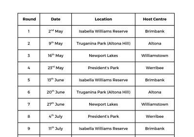 Events are held at various parks within the Brimbank, Wyndham and Hobsons Bay area between April – July with races commencing at 9.30 am. The program is usually finished within 1.5 hours, and minimal numbers of officials are required.